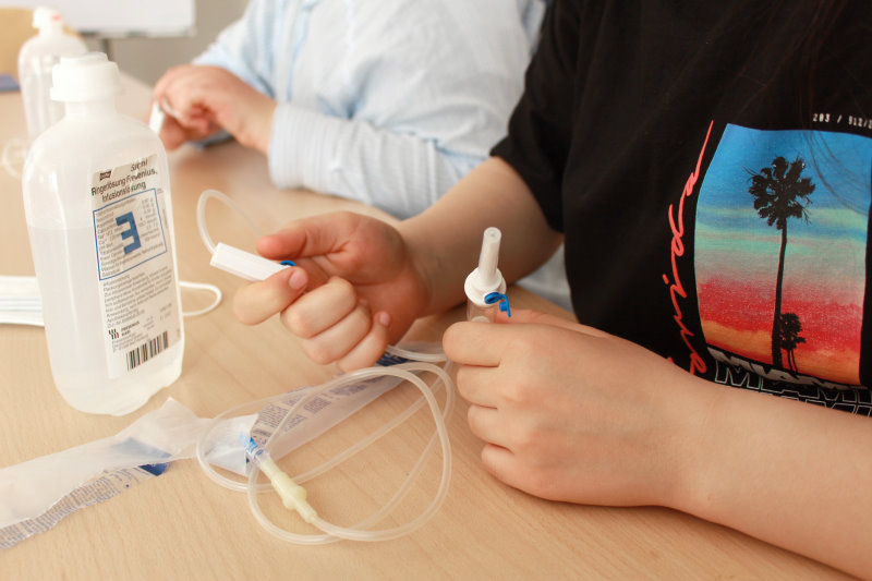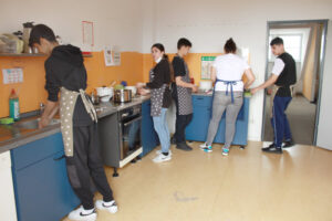 Die Schüler*innen konnten sich, beim Träger Zukunftsbau in 4 Workshops die Berufsbereiche Medizin/Pflege, Handwerk, Gastronomie und Büro näher anschauen. Dabei erprobten sie die Herstellung einer Lampe, die Arbeit an und mit Patienten in der Simulation, die Arbeit in der Gastronomie, nebst Eindecken und Kochen und Beispiele eines Tagesablaufes in einem Büro.