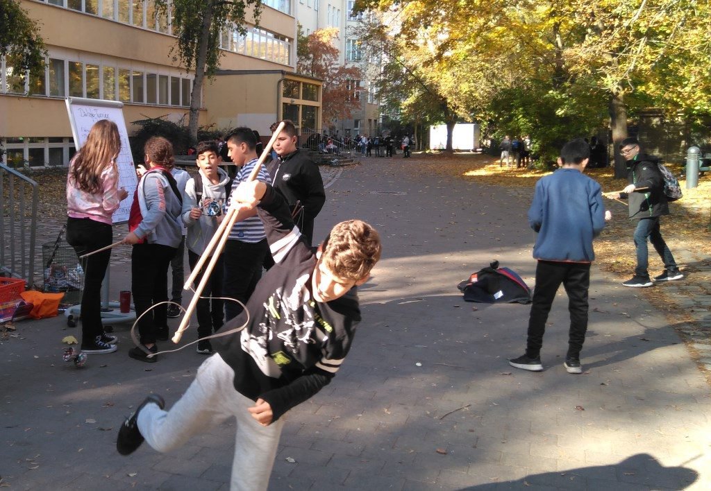 Am Freitag den 12.10.2018 hat bei uns an der Hemingway-Schule in der großen Hofpause auf dem Schulhof ein Diabolo-Turnier staatgefunden. Das Wetter war zum Glück richtig super. Warm, super und mit viel Sonne. Bei dem Turnier konnten alle Siebtklässler mitmachen. Wenn die anderen Klassen auch ein Turnier wollen, könnte man auch mehrere Turniere machen.