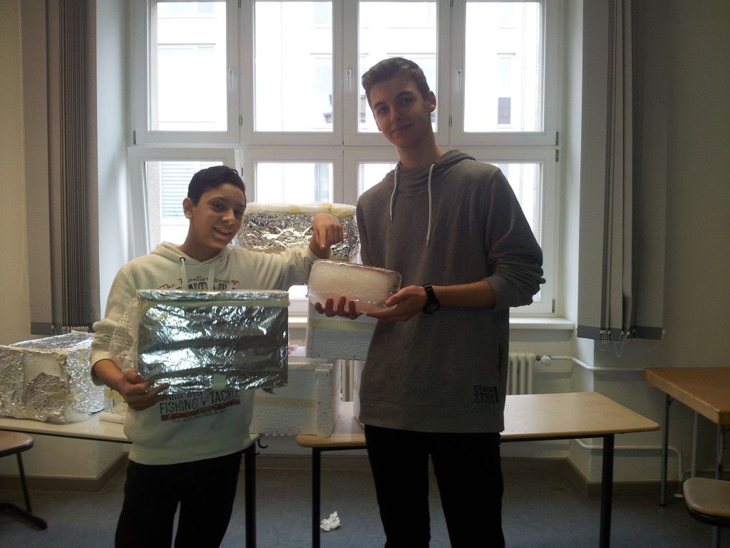 Jedes Team fertigte zunächst eine kleine Kiste aus Styroporplatten. Das war wegen der vielen Krümel eine ziemliche Sauerei! Nachdem die Kiste fertig war, sollte sie möglichst gut gegen Wärme von außen gedämmt werden. Das heißt, es sollte so wenig Wärme wie möglich in die Kiste gelangen können. Die Physikprofis der 8b wussten, was sie zu tun hatten: Sie mussten versuchen, die Wärmeströmung, Wärmeleitung und Wärmestrahlung in die Kiste so gering wie möglich zu halten. Dazu wurden verschiedene Dämmstoffe (Aluminium- und Luftpolsterfolie, Styropor, Wolle, Watte und Klebeband) zur Verfügung gestellt.