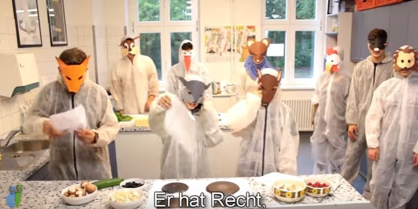 Der seit 2009 ausgetragene Wettbewerb „KLASSE, KOCHEN“ fand dieses Jahr unter dem Motto „Küche queerbeet – Leckeres aus Garten, Feld und Wald!“ statt, zu dem die Bewerbungsbeiträge gestaltet werden sollten. Die Hemingway-Schule, vertreten durch den Rap & Reims-Profilkurs um den Dozenten Markus Gram aka LMNZ, gestaltete ein Musikvideo zu einem selbstgeschriebenen Rap, den die Schüler*innen dann gemeinsam im Tonstudio aufnahmen und vor laufender Kamera performten. Entsprechend des Mottos battlen sich die Tiere des Waldes und des Feldes, wer denn nun das beste Zeug zum Essen hat.