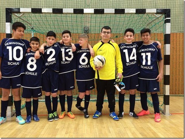Mit 2 Siegen und einer 0:1 Niederlage in der Vorrunde, einem 3:1 im Halbfinale nach 7m Schießen gegen das Diesterweg-Gymnasium und einem 2:0 im Finale gegen die Schule am Schillerpark wurde die Fußballmannschaft der Hemingway-Schule der Jahrgänge 2001 und jünger Hallen-Meister.