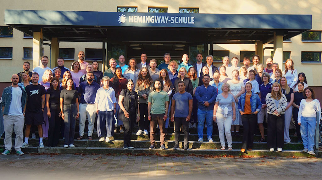 An der Hemingway-Schule arbeiten 56 Lehrer und Lehrerinnen. Unser gemeinsames Bestreben ist es, gemeinsam mit den Sozialpädagogen und den Mitarbeitern des Ganztags und des Jugendclubs new way die Lernumgebung an der Hemingway-Schule so zu gestalten, dass sich die Schüler zu erfolgreichen, verantwortungsvollen und gesunden Mitbürgern entwickeln können und sich alle Beteiligten an unserer Schule wohlfühlen.