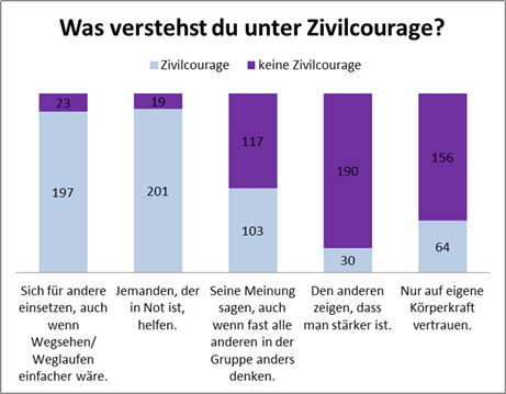 Wir beschlossen, dass wir eine Befragung zum Thema Zivilcourage in den Klassen durchführen, mit Fragen, was unter Zivilcourage verstanden wird. Die Ergebnisse haben wir in Diagrammen ausgewertet und auf Plakaten sichtbar gemacht.