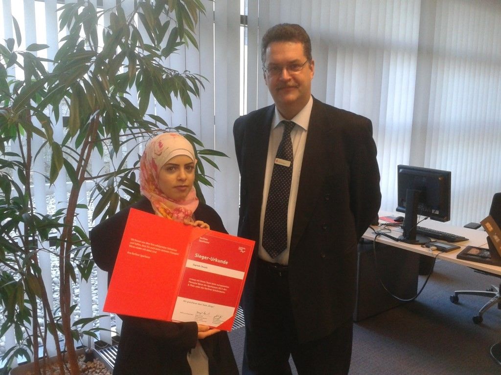 Zaynab Cheaib (Klasse 10 c) nahm stellvertretend für das Team „Bingo“ den Gewinn in Höhe von 200 € aus den Händen von Herrn Tergan (Berliner Sparkasse) entgegen. Herzlichen Glückwunsch.