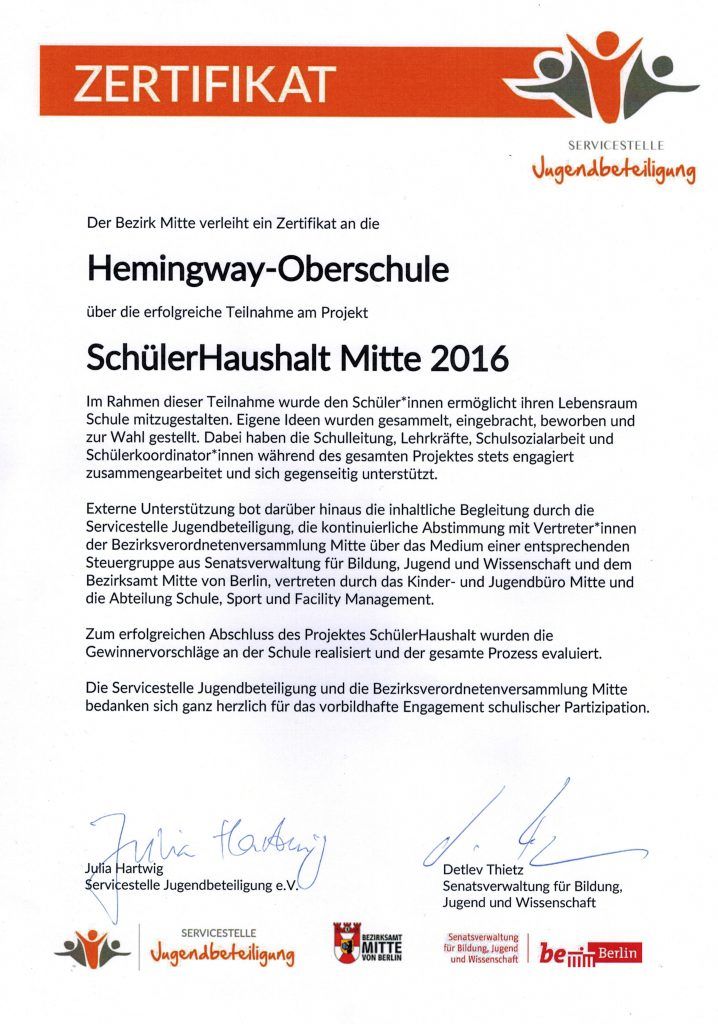 Für die erfolgreiche Teilnahme am Projekt “Schülerhaushalt” wurde die Hemingway-Schule zertifiziert.